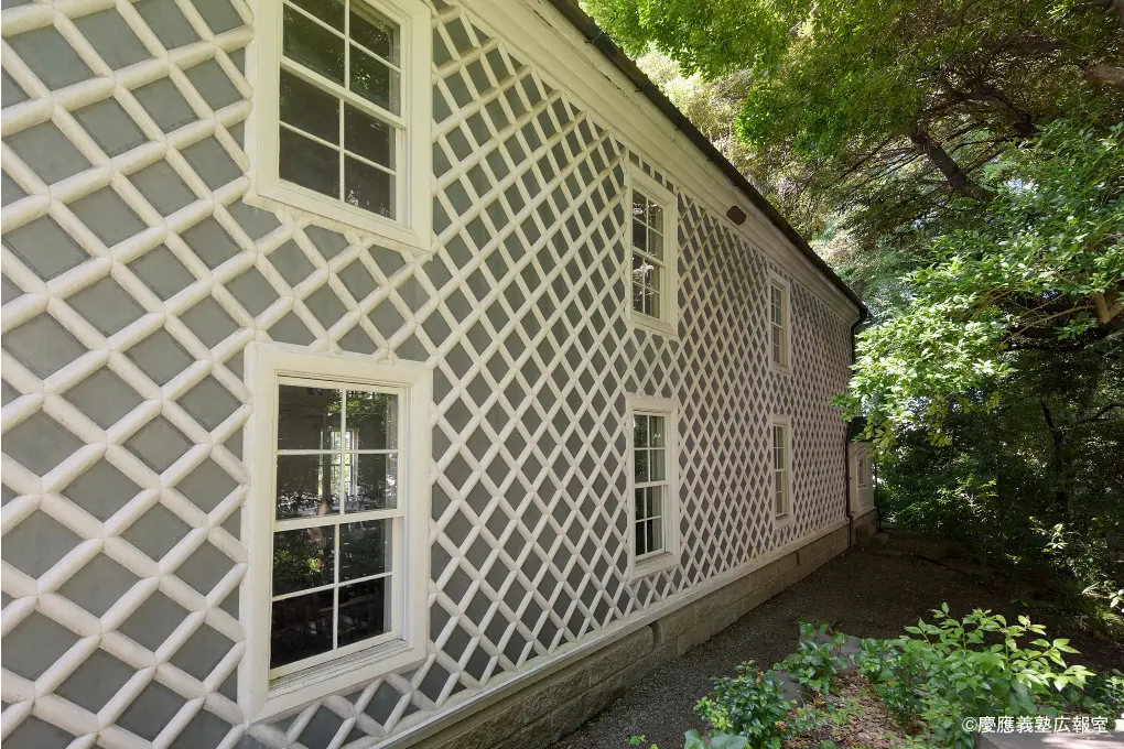 三田演説館は福沢諭吉の思想を今に伝える建築です。福沢諭吉は英語のスピーチを「演説」と翻訳、三田演説会を結成して演説を奨励し、それを行う日本で最初の演説会堂を構内に建てました。和風のなまこ壁の内側には、高い天井の広間。まだ西洋の建設技術が十分でなかった明治初期に、近代社会を自分たちでつくるための新しい空間を求めた構想力、それを実現した高度な大工技術に出会えます。
