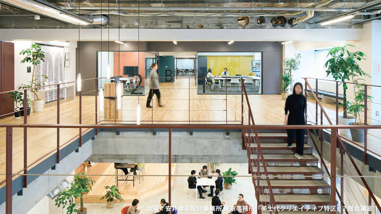 | 建築情報 | 安井建築設計事務所 東京事務所「美土代クリエイティブ特区」 竣工年│1966年、リノベーション:2024年 設計│リノベーション:安井建築設計事務所 施工│リノベーション:大林組(1F外装、階段周り)、コクヨ(内装) 受賞│屋内緑化コンクール2024 屋内緑化推進協議会会長賞、RCHITECTURAL DESIGN AWARD 2024 最優秀賞、第38回日経ニューオフィス賞ニューオフィス推進賞、2025年度グッドデザイン賞、第20回日本ファシリティマネジメント大賞 最優秀賞(鵜澤賞) |