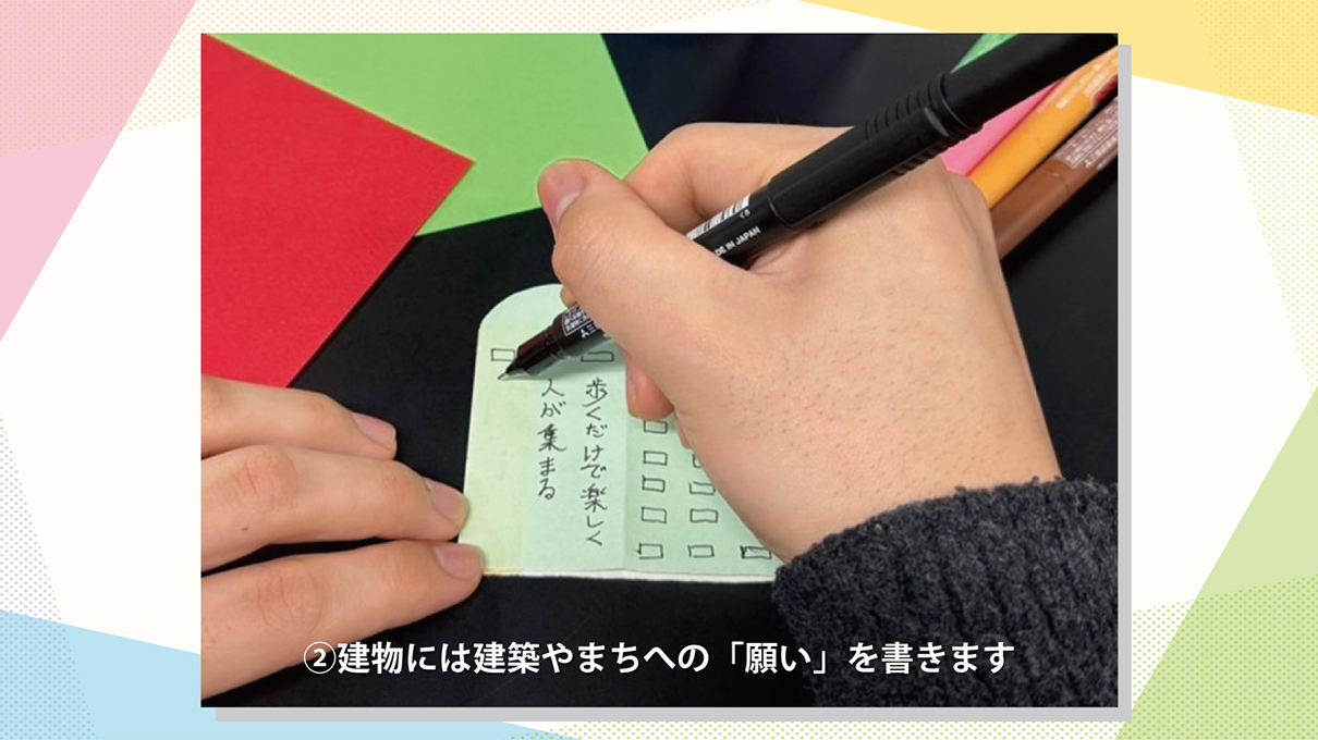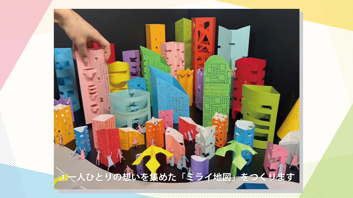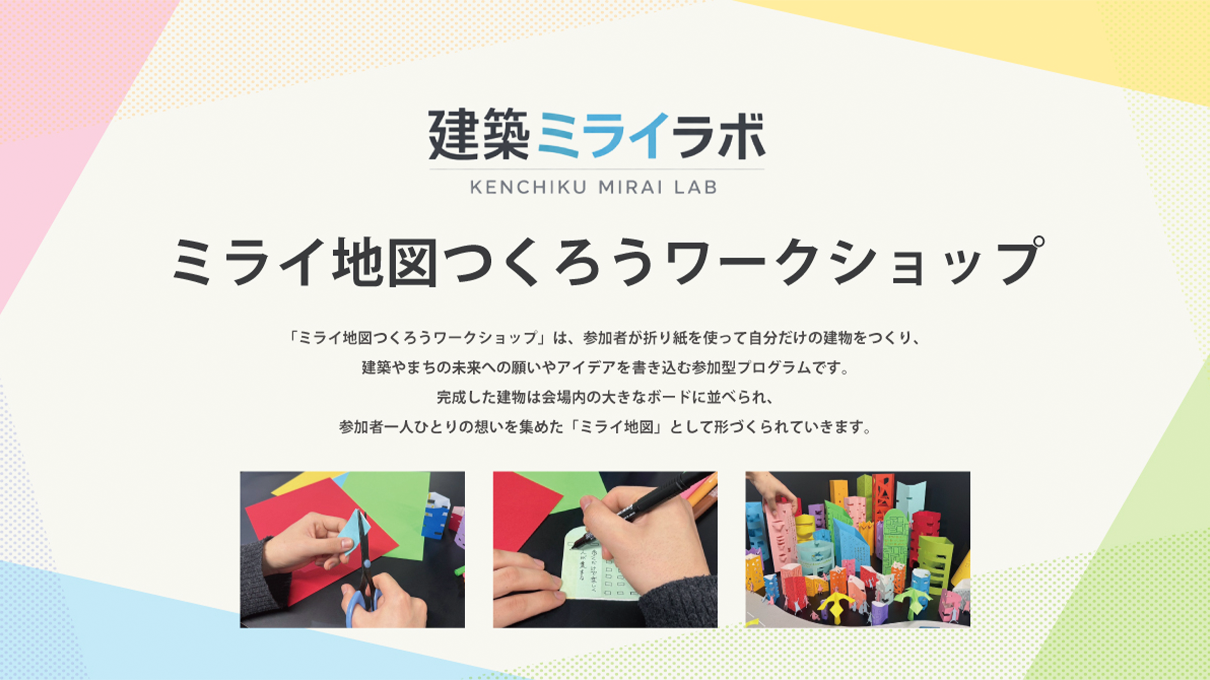 「ミライ地図つくろうワークショップ」は、参加者が折り紙を使って自分だけの建物をつくり、建築やまちの未来への願いやアイデアを書き込む参加型プログラムです。完成した建物は会場内に並べられ、参加者一人ひとりの想いを集めた「ミライ地図」として形づくられていきます。多様な建物が集まることで、未来の都市や暮らしの姿が可視化され、建築と社会の関係について楽しく考える場を生み出します。小さなお子様から大人まで気軽に参加でき、建築やまちを身近に感じながら楽しめる内容となっています。参加者には記念品をご用意しております。本ワークショップは、建築を通じて社会課題や未来のまちづくりについて考える「きっかけ」を創出することを目的としています。